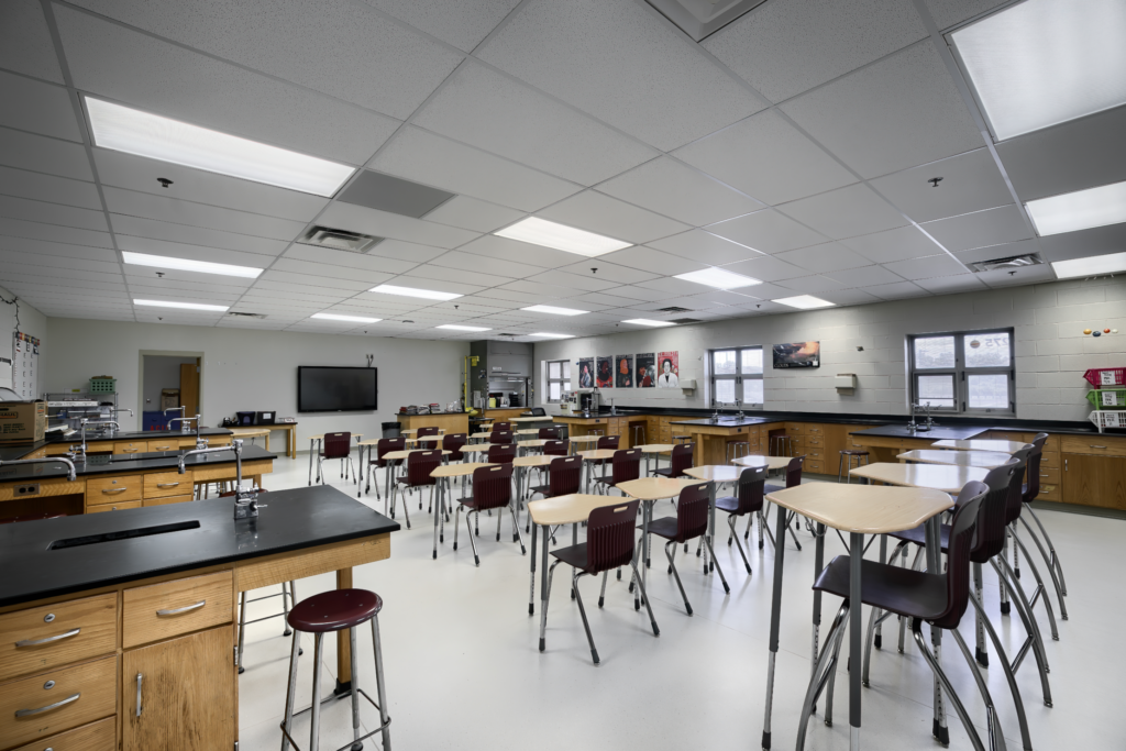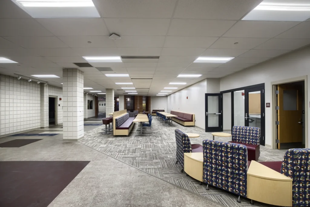 The program for this $24 million high school addition/renovation includes 42,000sf of expansion, providing a new auxiliary gymnasium, new media center, 11 new classrooms and 5 new small group rooms. 157,000sf of comprehensive renovations were also included, renewing and enhancing the existing administrative suite, 2-story classroom wing, student dining commons area, and lobbies, corridors and public spaces throughout. Mechanical, electrical and plumbing systems have been substantially replaced and/or upgraded, and new fire detection and suppression systems were added to the entire facility. Significant site improvements and utility work were also included.