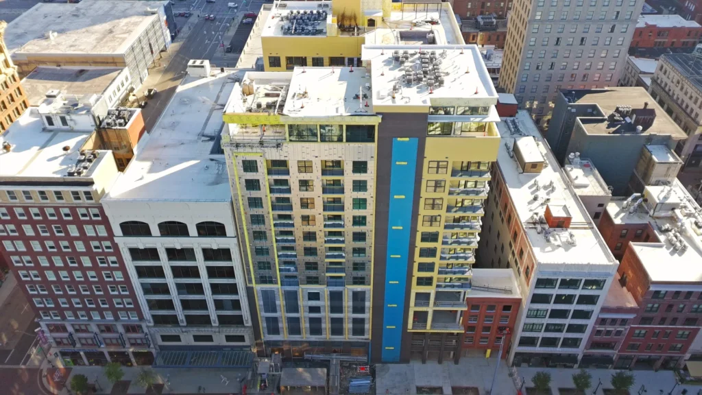 New 15-story development in downtown Columbus that includes 152 residential units, 350 space parking garage, retail space, and rooftop pool. Will include an 8-story concrete podium with 9 floors of residential space. Work is being completed on a tight urban footprint with challenging site logistics.