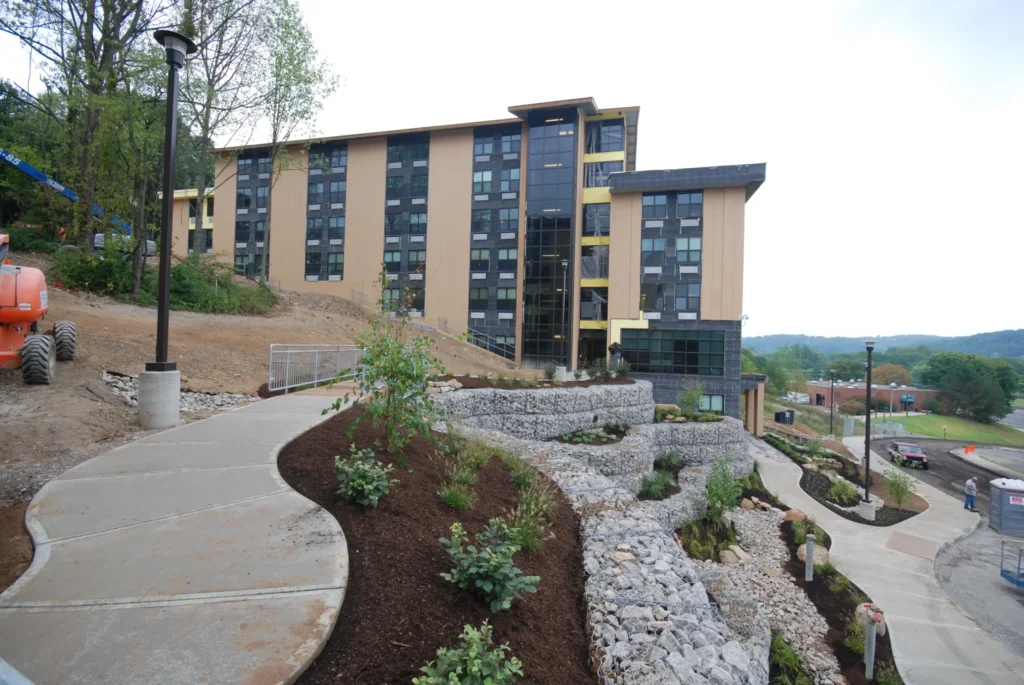 Ruscilli was selected by Hocking College to construct its new 402-bed student housing facilities. Two residence halls were constructed on the side of a hill containing mine shafts abandoned in the 1930’s. The mines had to be grouted and a deep foundation was put in place for the two structures. A cost-effective approach was implemented using a steel staggered truss system to frame the two seven-story buildings with a minimal amount of columns. Major rerouting of campus traffic patterns was necessary during the 16-month construction schedule without disrupting the ongoing college activities.