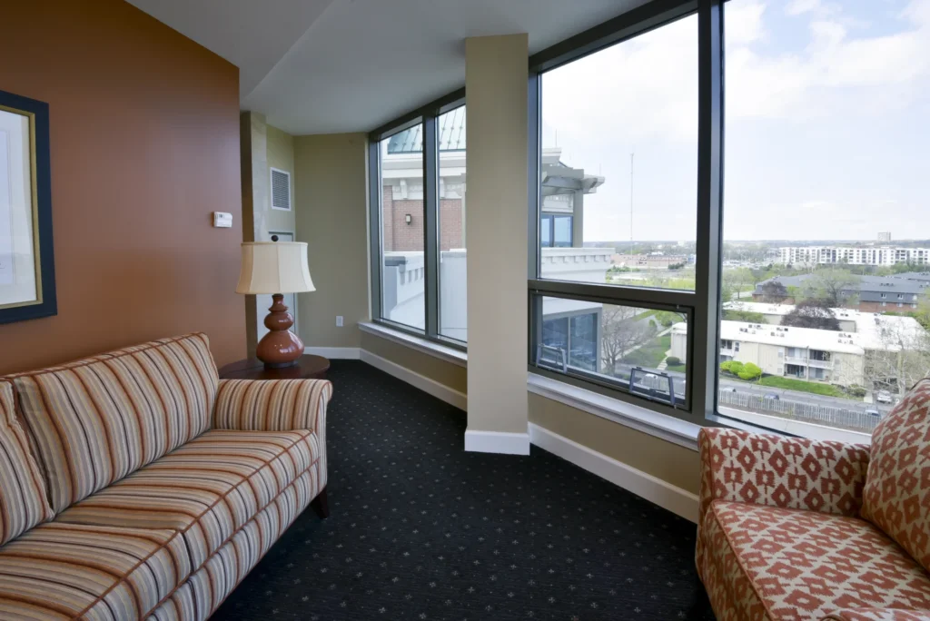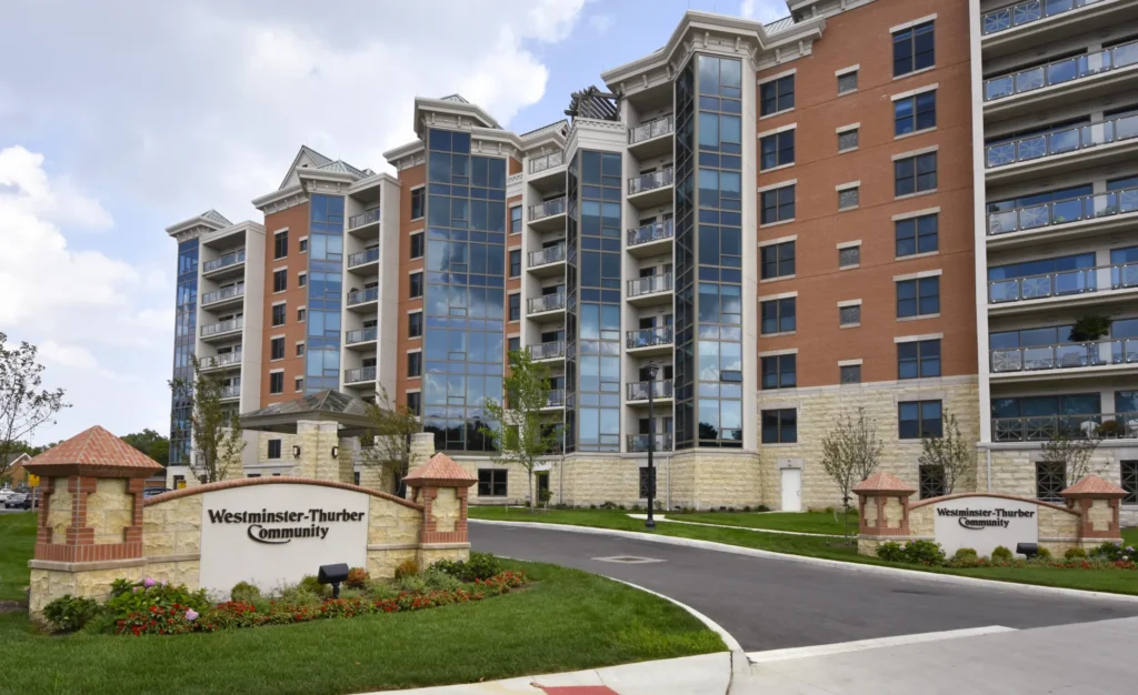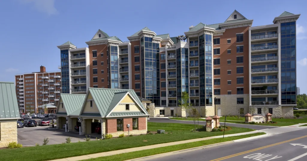 This 68-unit 177,000 square foot independent senior living complex offers six levels of high-end living space situated above a two level parking garage. The upper floor features a plaza roof terrace overlooking downtown Columbus. The fully sprinklered structure utilized concrete auger cast piles, grade beam foundations and post-tensioned concrete floor slabs. The building envelope consists of aluminum clad wood windows and storefront complimented by a brick and curtainwall façade accented with metal roof components. The mechanical system includes a packed rooftop chiller with vertical hydronic heat pumps serving each of the resident units. The facility also offers an emergency backup generator to provide power to the individual residences and common areas.